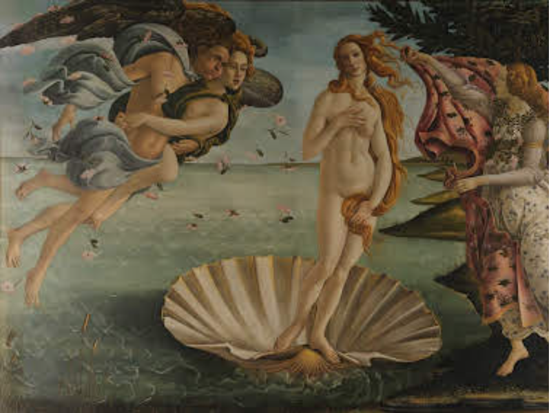 A figura de Vênus emergindo de uma concha convida à contemplação e ao questionamento.